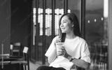 Portrait image of a beautiful young asian woman holding and drinking iced coffee in cafe