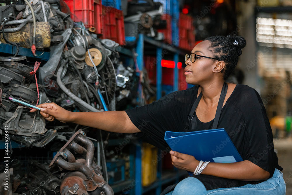 African American worker women wear spectacles make a note of the product list on clipboard in factory auto parts. female employee business warehouse motor vehicle.