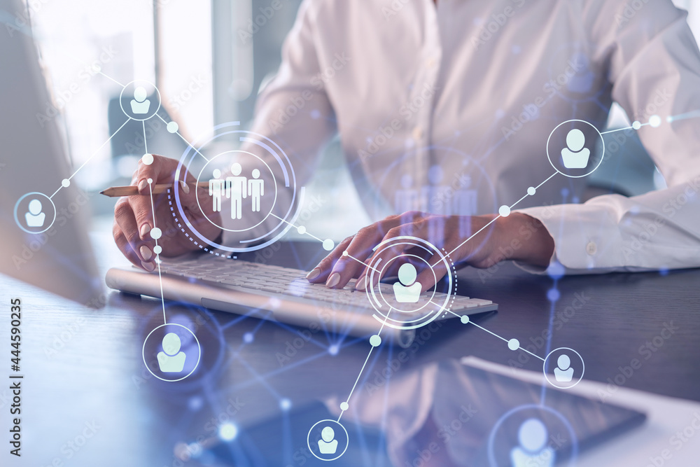 HR woman specialist is typing the keyboard in the internet to find the best candidates to create international network in recruitment process. Formal wear. Social media hologram icons.