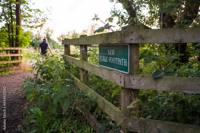 Close-up, shallow focus of a New Public Footpath seen seen at the entrance to a copse area in a rural forest. A walker can be seen in the path.