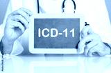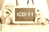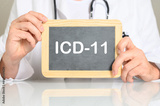 Arzt mit einer Tafel auf der ICD-11 steht. Diagnosekatalog für medizinische Erkrankungen