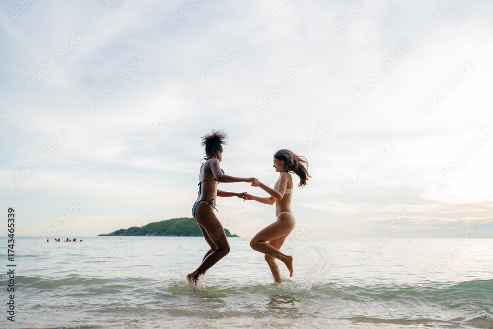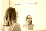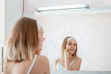Young smiling woman apply skincare moisturizer body cream on face in bathroom after shower. Happy teenage girl do Self Care morning routine. Beauty spa treatment at home.