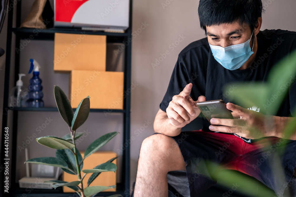 Asian male hand writing order product list on note for online customer in warehouse home office ordering products from online to business cargo supply market service delivery form home office