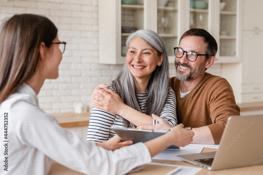 Successful positive deal. Lawyer financial advisor helping consulting showing contract mortgage loan credit business startup, signing documents by matute middle-aged couple at home