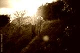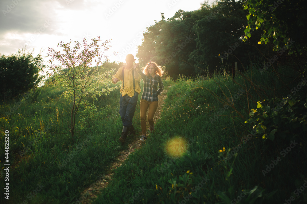 Loving hipster couple walking in the field, kissing and holding hands, hugging, lying in the grass in the summer at sunset. valentines day