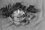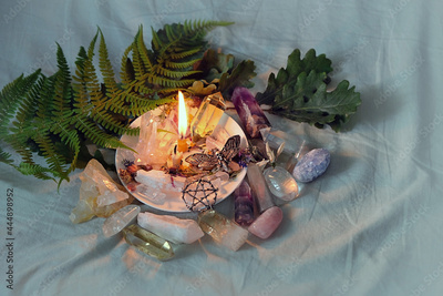 gemstones, candle, amulet, fern leaf on fabric background. witch items for Esoteric spiritual Ritual. aura cleansing. modern wicca and paganism concept