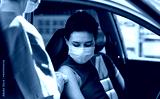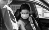 Caucasian female doctor from public health in blue hospital uniform and face mask stand hold vaccine syringe needle injection on woman patient shoulder in drive through car vaccination queue