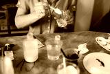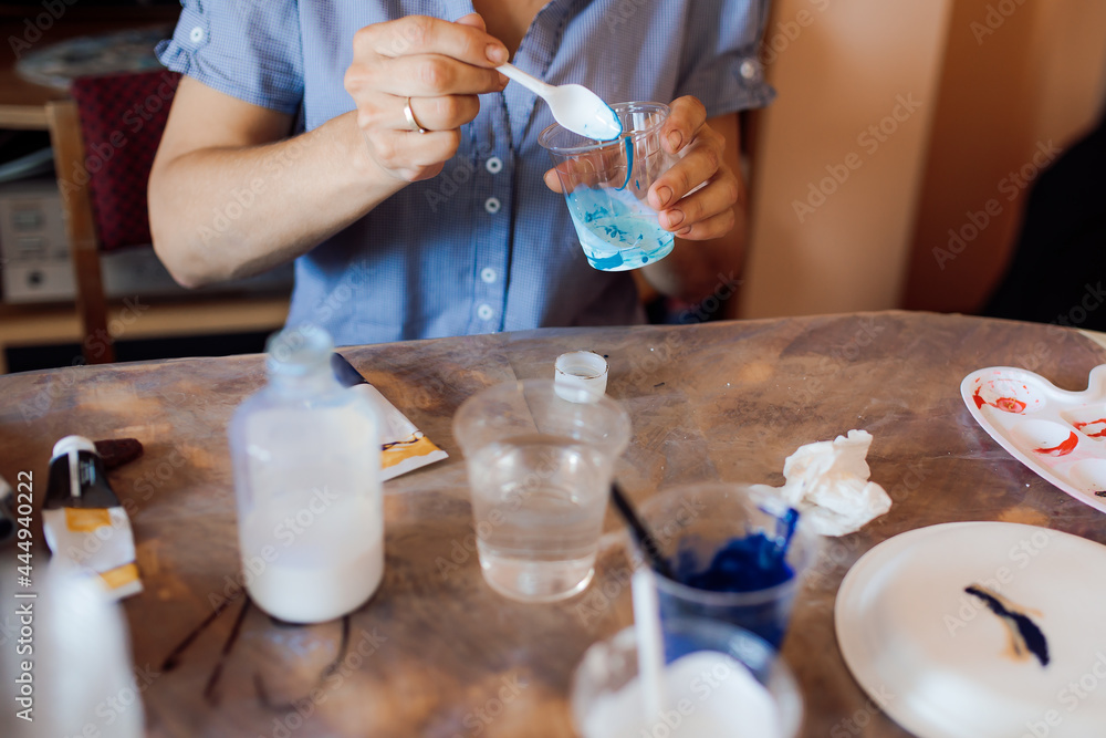 artist working on creating picture in art studio. Interior painting. Hobbies and crafts. Happiness and creativity.