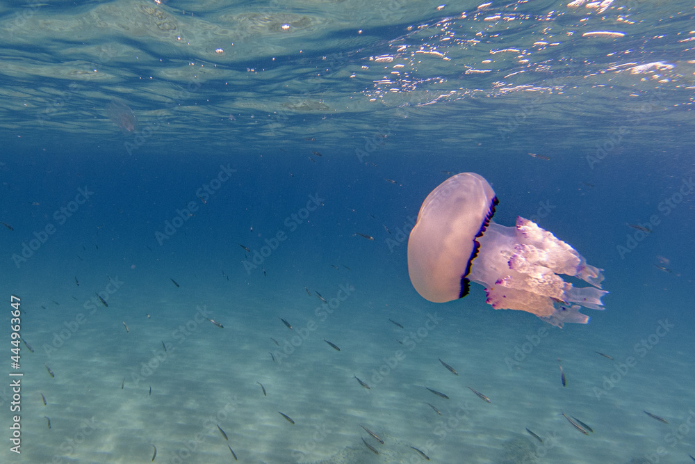Barrel Jellyfish underwater Rhizostoma pulmo in turquoise sea