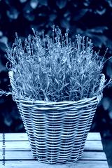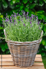 basket with flowers. woven pot of lavender outside in the garden. Lavender flowers in the pot outside in summer. Copy space