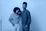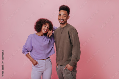 Charming male and female friends smiling on pink background. Woman in purple sweatshirt and man in brown outfit look into camera