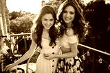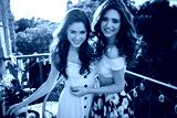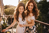 Girls in great mood posing on terrace. Smiling lady in floral skirt and white top hugs young woman in light dress on balcony.