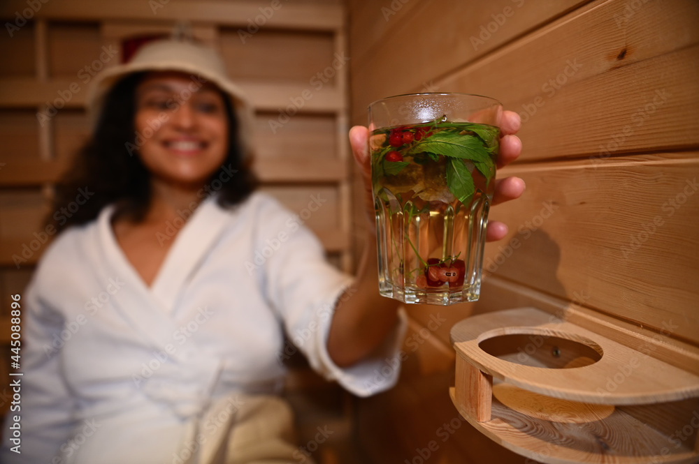 Soft focus on a glass with water with mint, berries and cherries in the hands of a blurred woman relaxing in a wooden sauna
