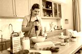 culinary, baking and people concept - happy smiling young woman cooking food on kitchen at home and using immersion blender