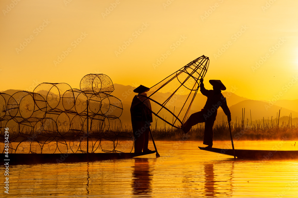 Silhouette fishermen catches fish for food in sunrise rays at Inle lake ,Myanmar .Intha people lifestyle with early morning sun sky.