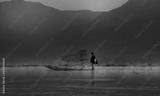 Silhouette fishermen catches fish for food in sunrise rays at Inle lake ,Myanmar .Intha people lifestyle with early morning sun sky.