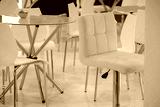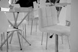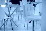 Office furniture in white. Armchair and table with glass surface.