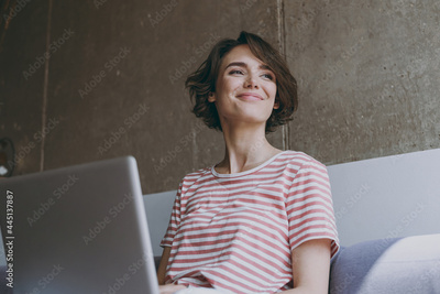 Bottom view young happy fun freelancer copywriter woman 20s wear casual clothes sit on grey sofa work online with laptop pc computer rest relax indoors flat at home People lifestyle leisure concept