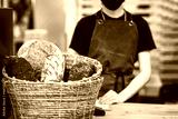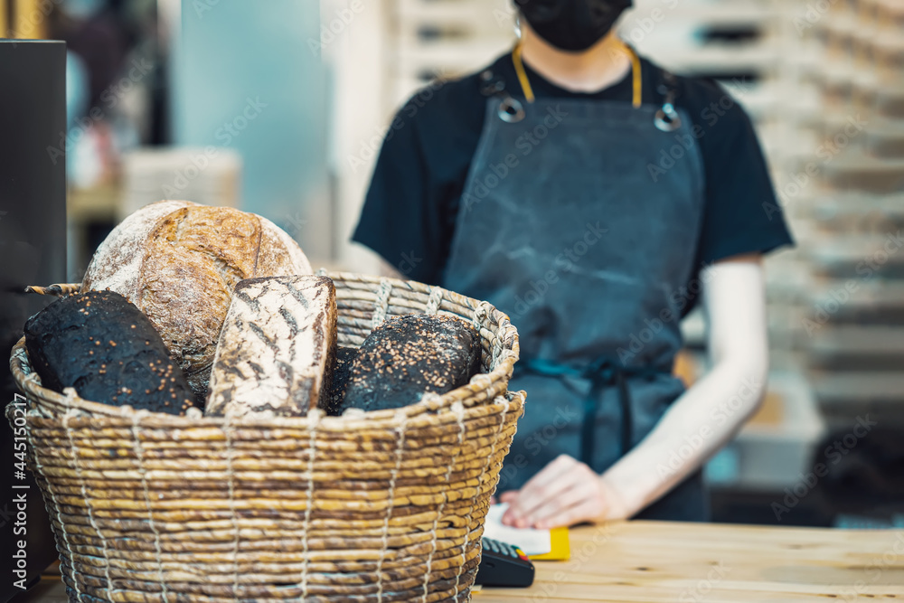 Wicker basket with different types of bread on a blurred background girl seller. Sale of flour products in a bakery