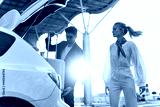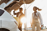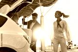 Blonde woman in white blouse and beige pants looks at boyfriend outside. Man in black suit puts yellow suitcase into car trunk.