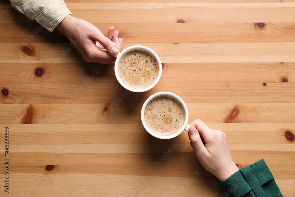 Women with cups of coffee at wooden table, top view