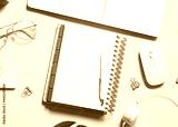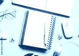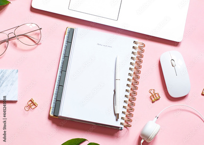 Business concept flat lay with a laptop on the pink background. Top view. Copy space