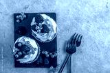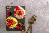 Delicious cupcakes with fresh raspberries and currants on on black slate over light beige background.