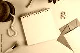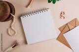 Craft paper envelope with white blank paper note mockup with makeup brushes, glasses and pearl beads on beige background.