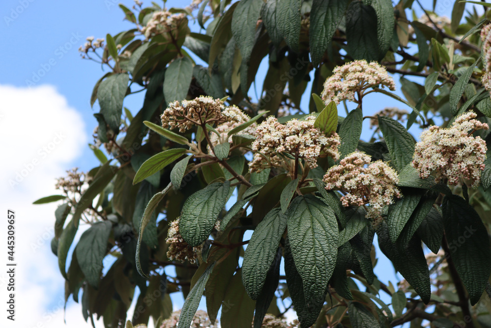 Viburnum rhytidophyllum tree in bloom in the garden. Viburnum bush with white flowers against blue sky