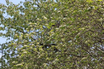 Viburnum lantana bush with white flowers on branches against blue sky on a sunny day