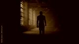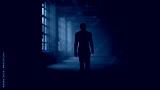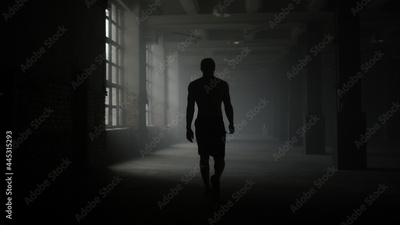 Man silhouette walking in dark corridor. Athlete taking break after workout