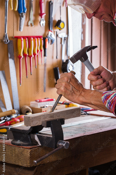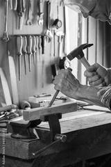 Carpenter working on the work bench, joinery tools and woodwork