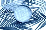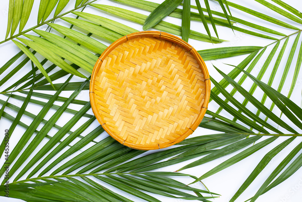 Wooden bamboo threshing basket on green leaves background.