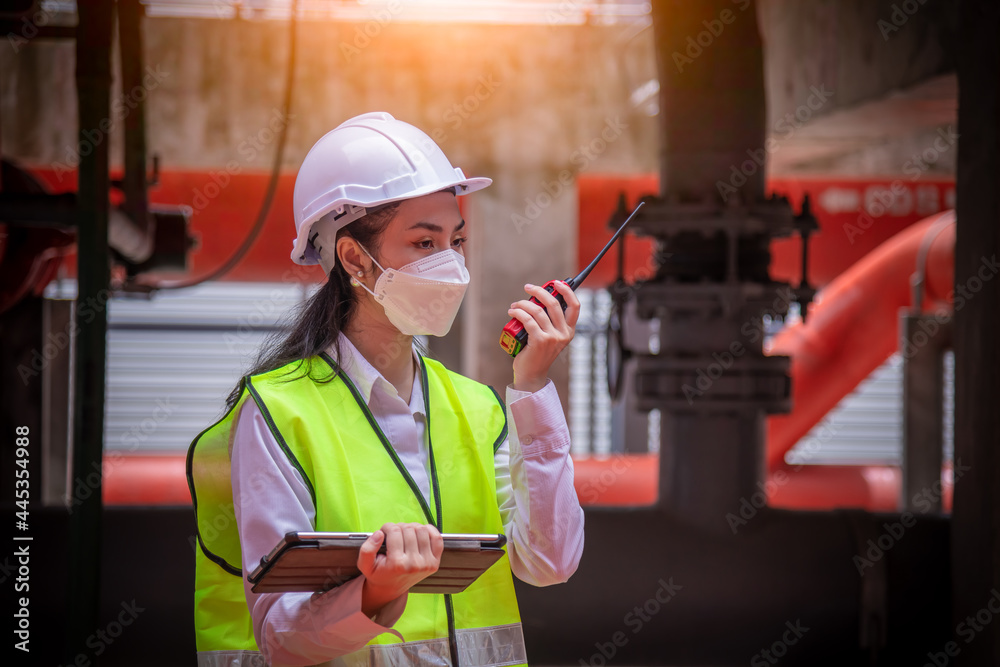 Engineer checking blueprint of industry cooling tower air conditioner is water cooling tower air chiller HVAC of large industrial building to control air system ,wearing mask for protect pollution.