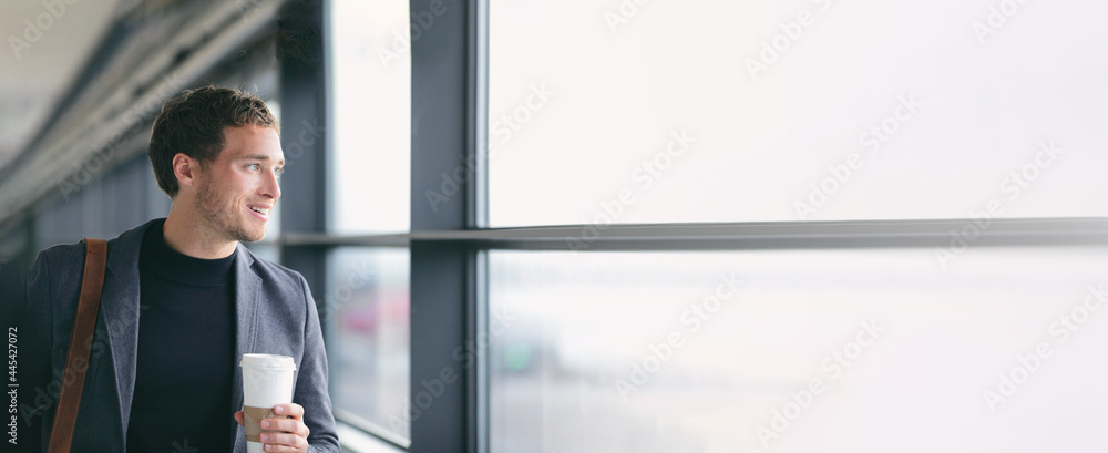 Businessman drinking coffee walking in airport. Casual urban professional smiling happy wearing suit jacket holding disposable coffee cup on travel. Handsome male model in his twenties.