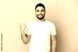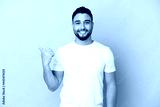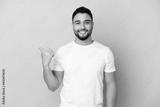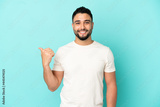 Young arab man isolated on blue background pointing to the side to present a product
