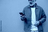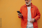 Man in orange outfit holds phone. Bearded gray-haired adult guy in stylish bright jacket looks in smartphone on isolated background..