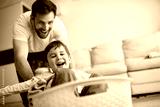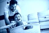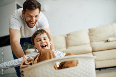 Carefree boy has fun while his father pushes him in a laundry basket at home.