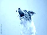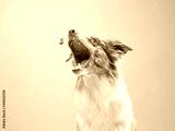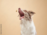 the dog catches a piece. expressive marble Border Collie. funny pet on on a beige background