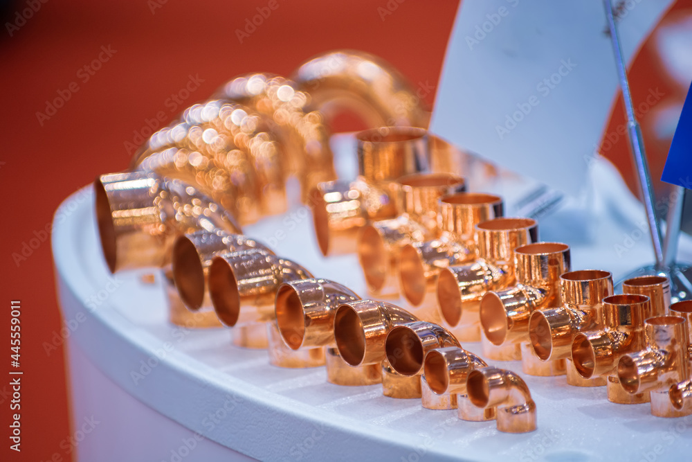 Copper pipe fittings. Set of connecting angle pipes made of copper