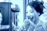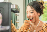 Beauty woman happy excited with her bakery in microwave ,bakery shop small business
