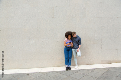 relationship friends young white man and black woman using mobile phone in the city with a background wall with copy space