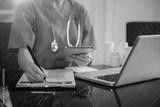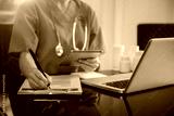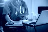 Medical students working with tablets and hospital documents