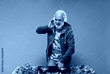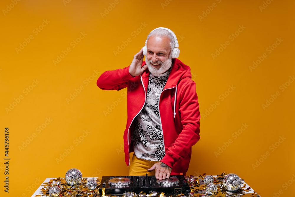 Happy man makes music with dj controller on orange background. Joyful guy with grey beard in red hoodie and white t-shirt posing..