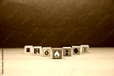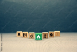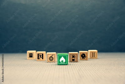 Fire prevention, Close-up cube wooden toy block stack prevent icon with door exit sing or fire escape with fire extinguisher and emergency protection symbol for safety and rescue.