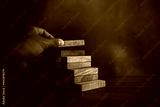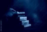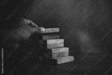 Close-up hand is placing wood block tower stacked in stair step with caution to prevent collapse or crash concepts of financial risk management and strategic planning.
