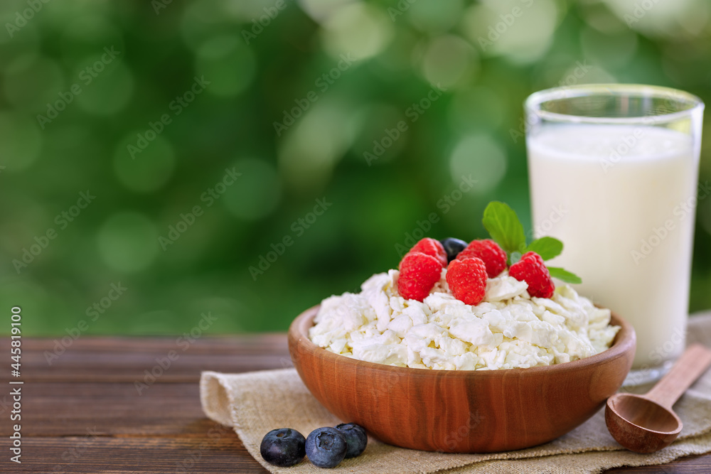 yogurt in glass and cottage cheese with fresh berries on table outdoors