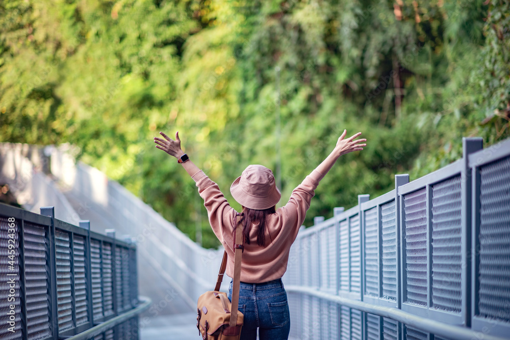Happy travel female on vacation. Traveler enjoy her trip and ready to adventure.