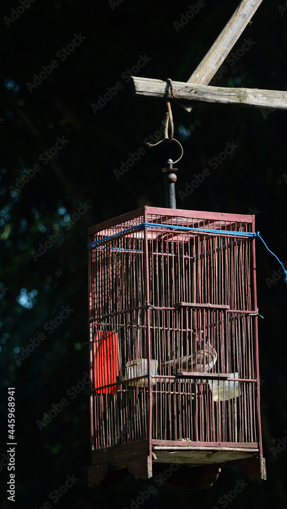 Bird cage hanging on a bamboo pole, dark background, focus selected