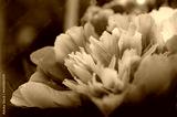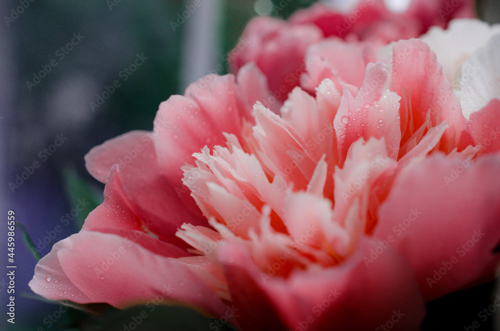 Soft focus. Blooming branches with peony flowers and buds. Close up photo as a natural background. Blurry background. White and pink peonies flowers. Floral background. Pastel peony flowers as floral